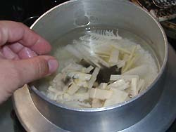| 米を普通に洗って、ザルに上げ、水切り後に水に浸す。その時に昆布も一緒に浸しておく。1時間ほどしたら、穴子のツメを少し入れて(ない場合は筍ご飯な感じで調味料を入れる)、真竹を切って並べる。 | 下処理した穴子(穴子の佃煮を参照)をぶつ切りにして上に並べる。米1合に対して穴子1匹。で、釣果に余裕がある日は、さらに1匹追加が贅沢分。今日は3合だから4匹とお裾分けだから御馳走。 |