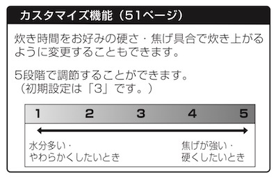 炊飯器のカスタマイズ機能ご飯の好みは人それぞれ,仕上がりはカスタマイズ機能で調整できます。自分の好みを見つけるのも楽しみですね。お米や気分によって変えてもいいと思います。 |