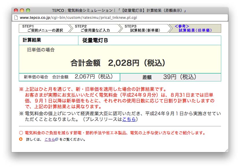 引越し当日に40A→20Aに変更。前は15A,部屋数も増えた…電気代UPか?さらに,9月から電気料金値上げ。実際は使用量も80kwと大きな変化( 2011年光熱費参照 )もなし,値上差額も39円と僅かだが,同条件で10月分はさらに+30円。簡単に値上げできる会社はいいね。 電気料金シミュレーション(9月20日)