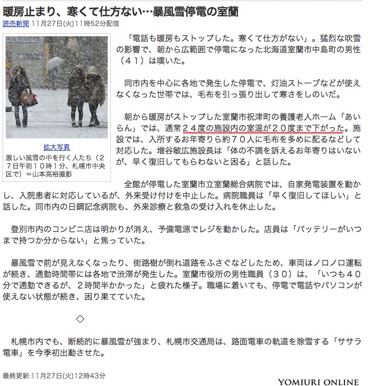 そりゃ,今時の生活で電気は無くてはならないけどさ,読売新聞の記事:暴風雪停電の室蘭にはガッカリ,停電したから寒くて仕方ない…北海道人でもそんななの? 一昔前なら暖房温度は18度,今でも20度が目標。記事になるって記者の感覚も呆れます。防災用品は防寒服も考えよう。あ,ちなみ我が家は12度,寒くないって!(11月27日)