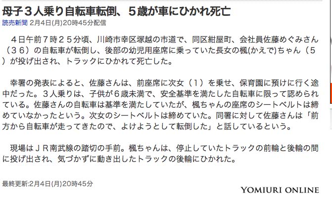 3人乗り自転車の痛ましい事故。なんでも規制には反対だが,逆に認可されたら誰でも…は変だ。規制は車体より人(の技量と体力)に掛けるべき,不公平でもいい,減速で転ぶレベルは乗らない! 災難は荷台の子供に掛かる。相当な脚力腕力とバランス感覚を持たねば,都会では不幸な状況は隣り合わせ。私が見る限り,3人乗り自転車の大半はフラフラで危なっかしい。(2月4日) |