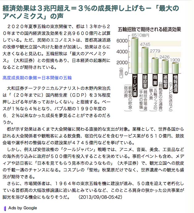 本当に民主主義なの?でもま,仕方ない(ってこの思考が日本人ね)。ニュースは経済効果ばかり…何の指標も経済&金&経済金金金…ほんとこの国の思考は野蛮で非文化的。経済発展効果は,意識の低いドライバーが増えた事故多発。思考回路低下で「危険物の取り扱いも知らない人間」も多数,子供は携帯持って知恵がついた?私はオリンピックを開催するから,福島をなんとかしよう!そんな方向に向かって欲しいです。(9月8日) |