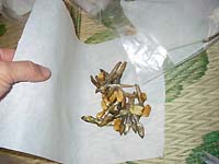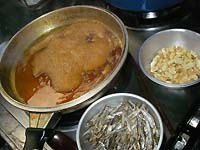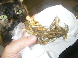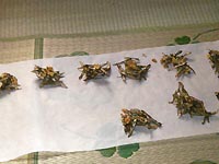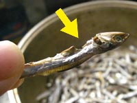ゴマメのはらわた部分を一匹づつむしり取る。すんご〜い手間ですが、この手間が感動の味わいを出します。これをやらないと苦味が出るので、より甘くする必要があり、市販品と同じになってしまいます。すぐに作らないならこのまま密閉袋に入れて保管します。 |