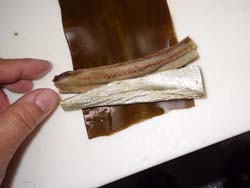 - 長さがはみ出ても気にしない!でも,なるべく幅広昆布には長い身欠きにしんを選ぶ。