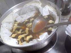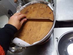 - さらに蓋をして,最初は強火で,ぐつぐつしてきたら火を弱めて煮る。火の強さは,ギリギリにぐつぐつする感じ。超弱火じゃ大鍋は煮えません。
