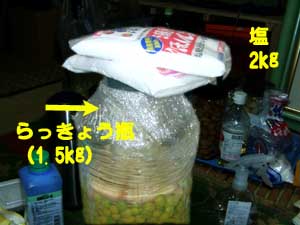 当たり前なんだけど1袋=1kgととても使いやすい重石になります。小梅の時期(5月下旬〜)ならば梅の為に買いためた塩や砂糖の袋がいい重石になります。積み重ねても崩れないし安定度も抜群。写真は、8リットル入りの梅酒用の瓶(10号サイズ)に小梅4kgを漬けて、コーヒー瓶入りのラッキョウ漬け(1.5kg)と塩の袋で重石を掛けた状態です。初日は4袋(合計4kg+1.5kg=5.5kg)で、翌日には1袋づつ減らしてと重石の加減が確実で簡単。ただ、小梅の時期じゃないと塩がこんなにないんですよね。 |
