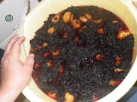 | 梅酢を抜いた状態〜8kg分 | 抜いた梅酢で紫蘇の発色 | 色ムラはあるがフワフワ状態。 |