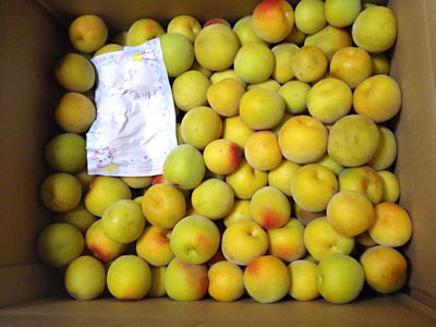 やはり朝に受け取るのと夕方だと梅のダメージはかなり違います。生梅の受取りは,なるべく近くに着いたらすぐに受け取るのがいいですね。今日は朝には着いていたのに一日置いて夕方でしたから,やはり熟梅は,時間との勝負。 上の落ち梅は全部OKで,下の木成り梅は,潰れちゃっているのが4個,仕分けして漬けなきゃ,, ってのが,3個。。他はサイズ混合でパズルの様に楽しみます。 |