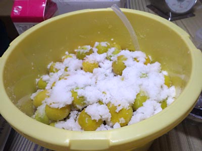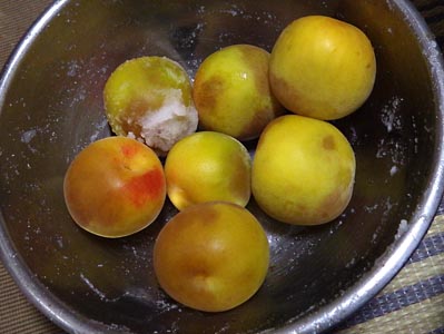 落ち梅 3.3kg それぞれを測ってみると,落ち梅3.3kg,木から採った梅7.4kgでした。森農園の梅は洗ってあるので塩を測ってバケツに放り込むだけで完了です。まずは,落ち梅から作業。 |