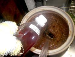 最初に塩を抜きすぎて味が今ひとつ?って感じたら,赤梅酢を入れて,また水分が飛ぶまで極弱火で煮る。最近は便利な道具が安価に入手できます。梅醤づくりには,100円ショップのシリコンヘラがとても便利。これと土鍋+金網で最強です。写真は1400gの梅肉と300gの砂糖,少々のミリン,塩抜きしすぎたので赤梅酢を入れている所です。 |